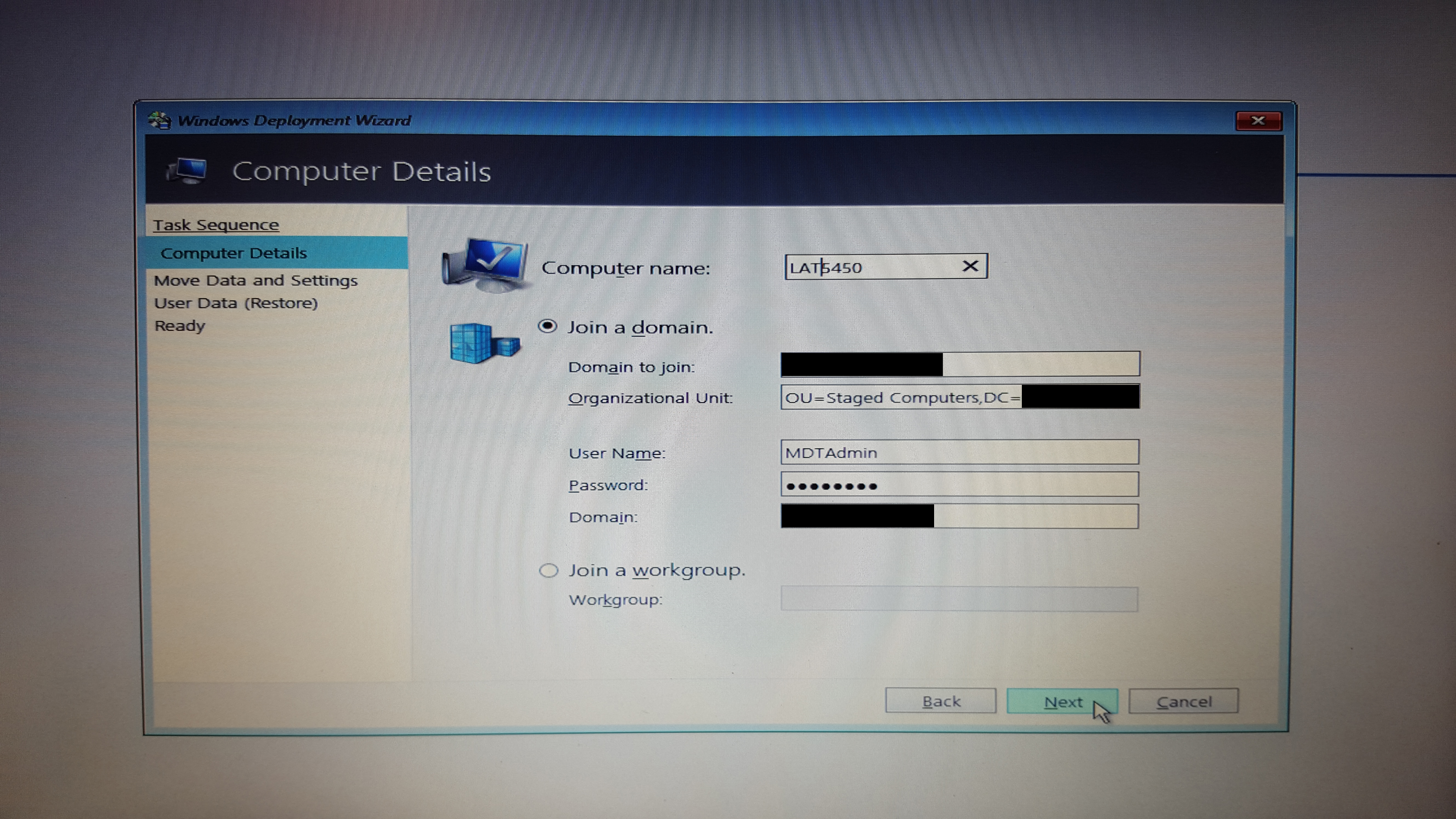 [CU001] JoinDomain=DOMAIN MachineObjectOU=OU=Staged Computers,DC=DOMAIN,DC=local DomainAdmin=MDTAdmin DomainAdminPassword=Password DomainAdminDomain=DOMAIN |