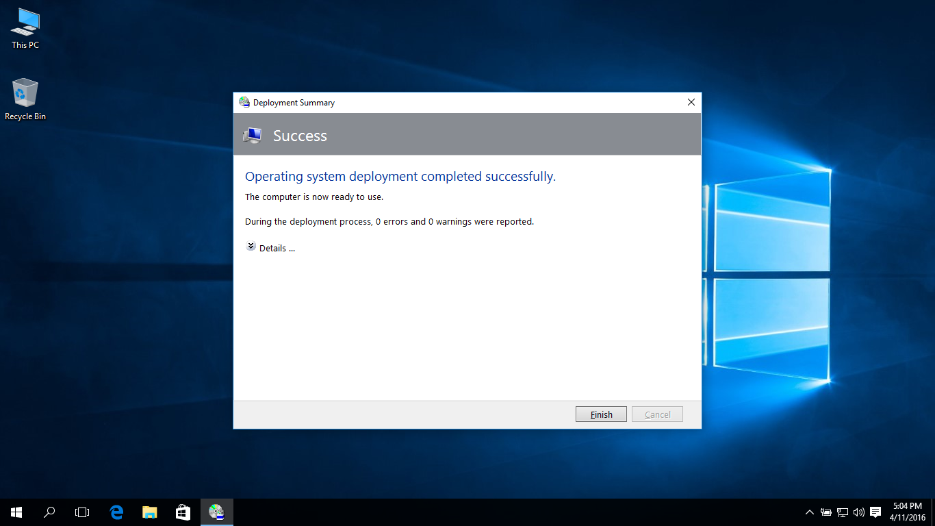 And finally, you should be greeted with a “Completed successfully” screen. And as you can see, by setting CopyProfile=True in the Unattend.xml, it copied over the customizations I made to the desktop icons and task bar.