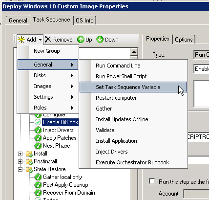 This lists all of the stages and steps the task sequence takes to apply an image to the new PC. There’s plenty you can do in here but we won’t get into that right now. For now, we need to expand the Preinstall section. Click On whatever step is right above Inject Drivers, then click on Add at the top of the columns, hover over General, then select “Set Task Sequence Variable”.