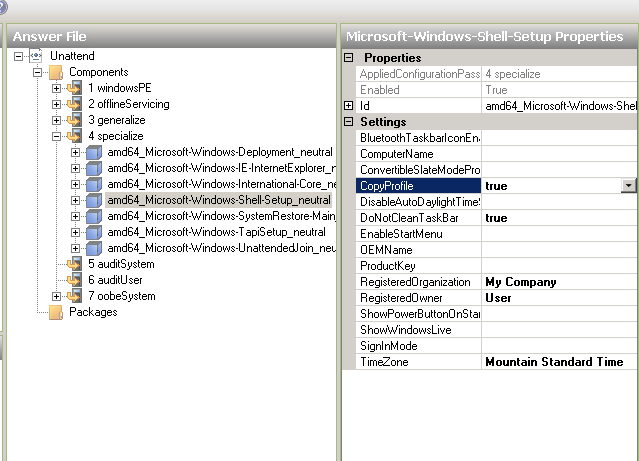 The first thing we’ll do is expand the Specialize phase, and click on the Shell Setup grouping (specifically amd64_Microsoft-Windows-Shell-Setup_neutral). In here, put your correct time zone, a product key if needed, and set the CopyProfile option to True. CopyProfile=True will copy all of your customizations from the administrator profile you configured in your reference image before you sysprepped it.